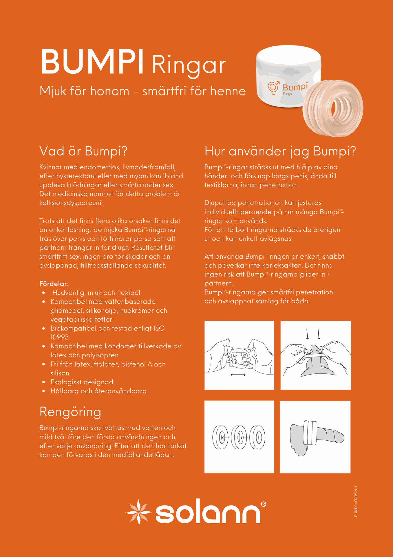 Tre mjuka, munkliknande ringar som fungerar som en naturlig stötdämpare och hjälper till att reglera djupet vid samlag vid upplevd smärta eller obehag. Ringarna placeras runt penisroten och kan användas individuellt eller i kombination för att hitta det djup som känns bäst för er båda. Tillverkade i hudvänlig medicinsk silikon. Levereras i praktisk förvaringsburk tillsammans med två sachéer vattenbaserat glidmedel.